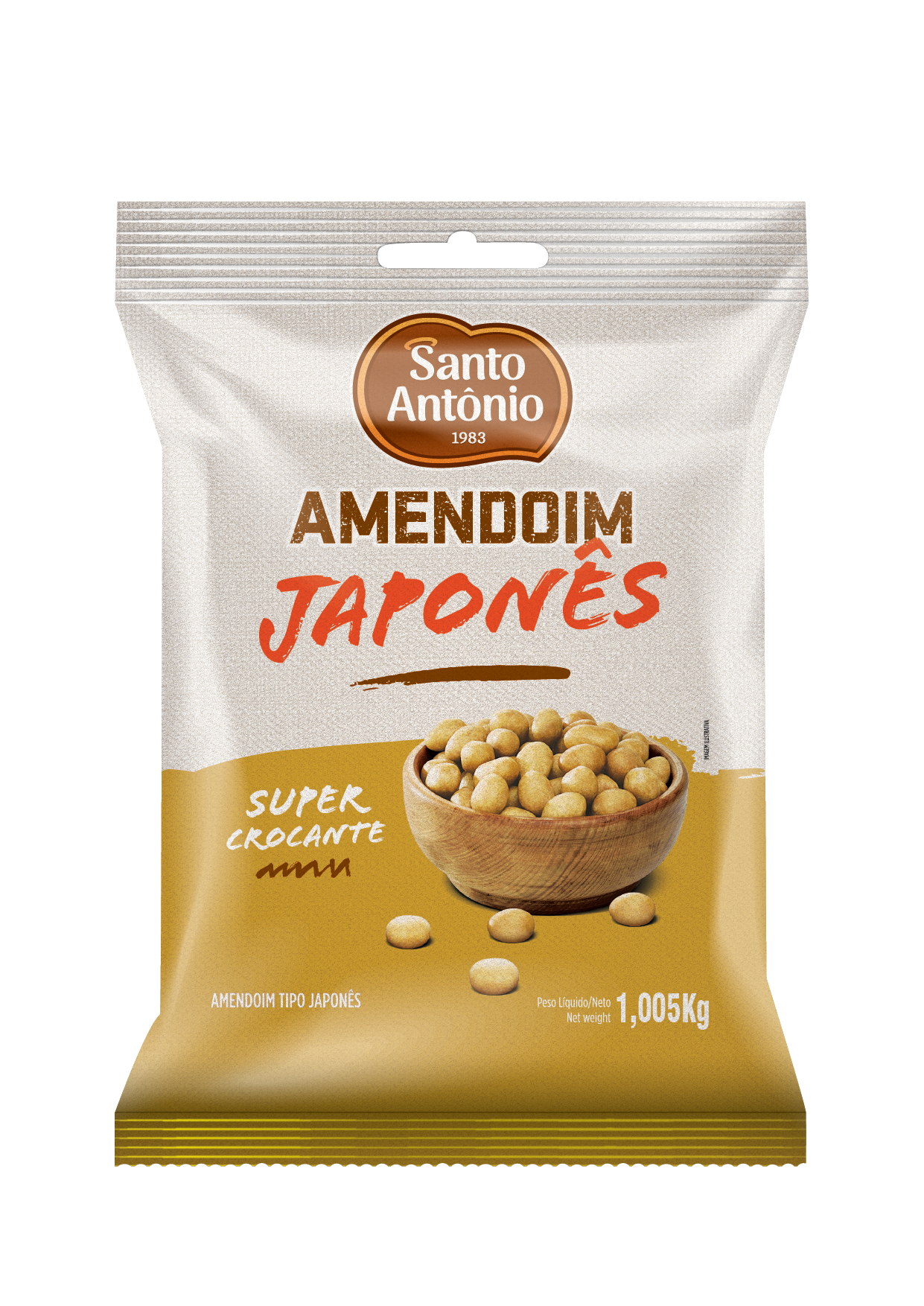 Ingredientes: Amendoim, farinha de trigo, amido de milho modificado, açúcar, dextrina de milho, sal, gordura vegetal mista de soja e palma, fécula de mandioca, realçador de sabor INS 621 e corante artificial tartrazina (INS 102).