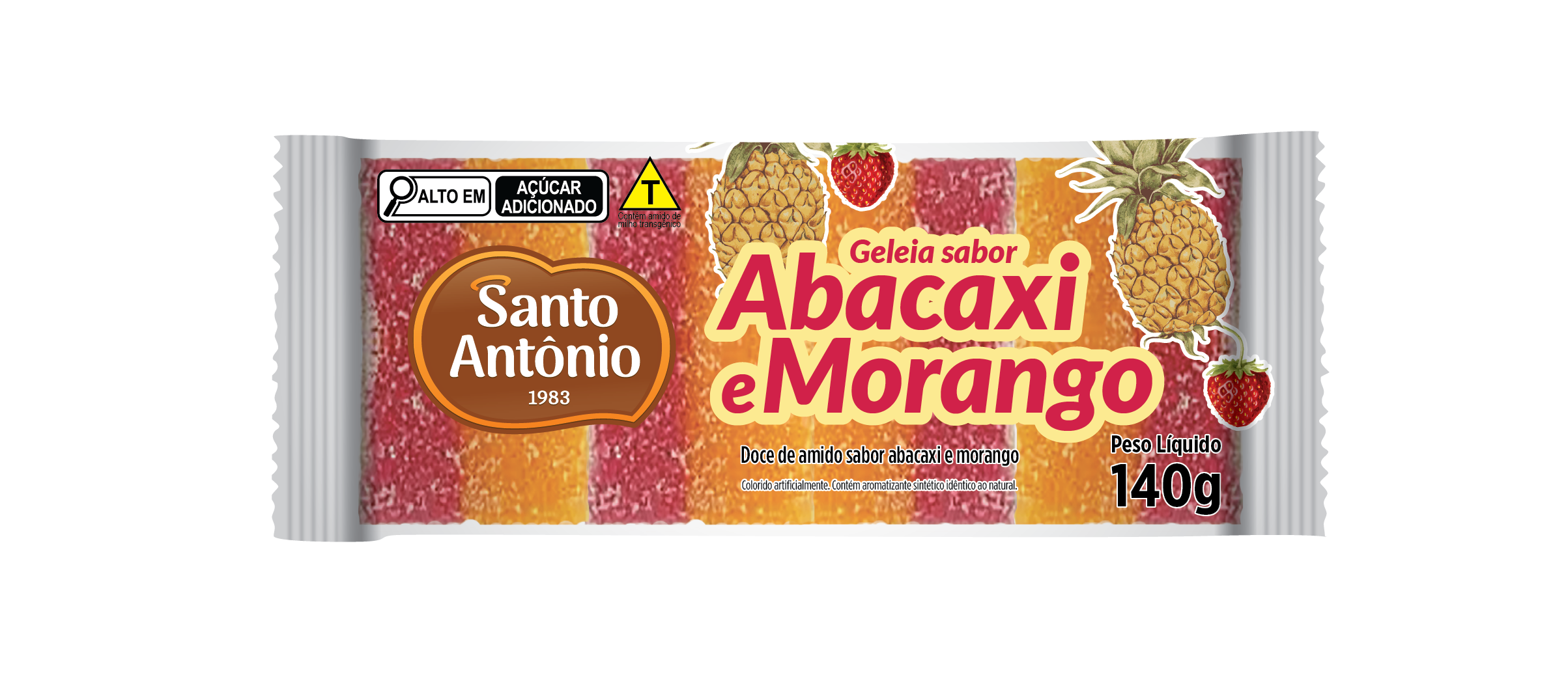 Ingredientes :AÇÚCAR, AMIDO DE MILHO MODIFICADO (ESPÉCIES DOADORAS DO GENE DO AMIDO DE MILHO MODIFICADO: *BACILLUS THURINGIENSIS, STREPTOMYCES VIRIDOCHROMOGENES, AGROBACTERIUM TUMEFACIENS, ZEA MAYS, SPHINGOBIUM HERBICIDOVORANS E DIABROTICA FIRGIFERA), XAROPE DE GLICOSE, ACIDULANTE ÁCIDO CÍTRICO (INS 330), ESTABILIZANTE TARTARATO ÁCIDO DE POTÁSSIO (IND 336I), CORANTES VERMELHO BORDEAUX (INS 123) E AMARELO TARTRAZINA (INS 102), AROMAS IDÊNTICOS AOS NATURAIS DE MORANGO E ABACAXI.