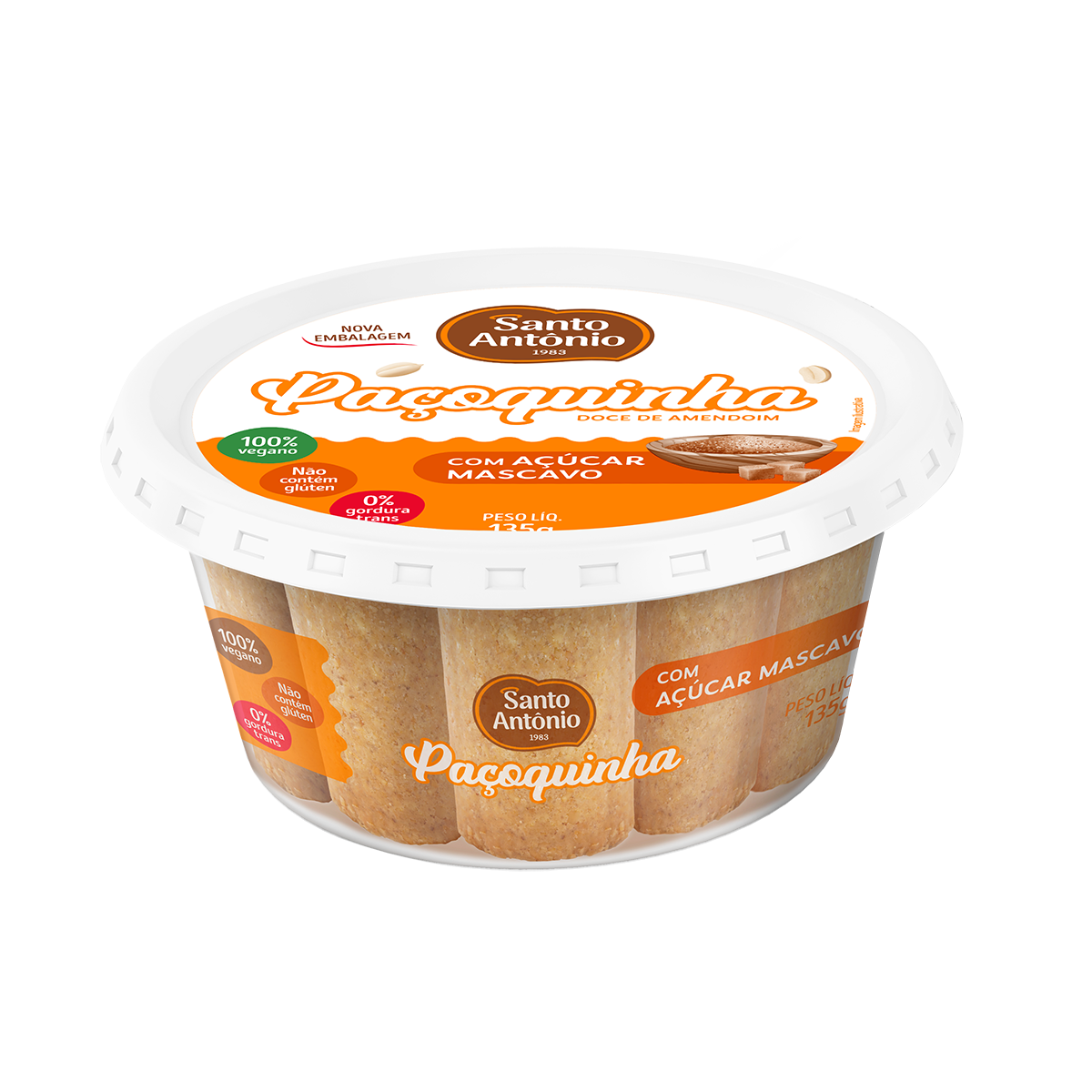 A paçoca no formato rolha, com uma cor bege suave e sabor característico de paçoca, enriquecido pela presença do açúcar mascavo. Possui um aroma marcante de amendoim e a textura tipicamente esfarelenta.